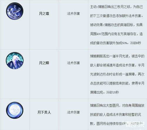 技能介绍:第一个技能主要的就是一个范围性伤害,也是我们主要的伤害技能,因为技能时间短伤害高是很多玩家喜欢的,但是如果对方英雄突到我们阵容中而没有队友的辅助,那么他们会受到额外的伤害哦,第二个技能不是一个助力伤害技能,而是一个减速技能辅助的,能够造成防御屏障还能够保证对手不能轻易靠近我们,大招就是以自我为中心释放一个圆月,伤害爆炸,同时还有短暂的沉默效果哦。