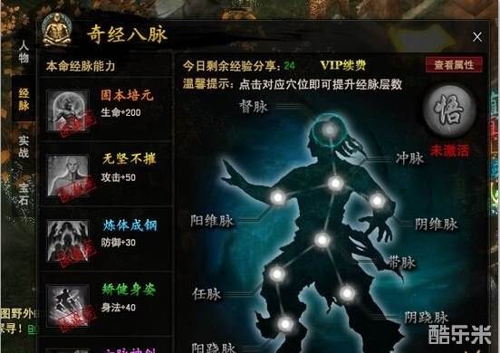 可通过点击穴位按钮,打通经脉穴位,穴位全部打通后,可贯通该条经脉。根据穴位不同加成不同的属性数值。