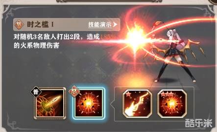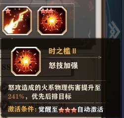 怒气技能:(时之槛I):对随机3名敌人打出2段,造成185%的火系物理伤害,该怒气只能特点就是能攻击3名目标,更加快速的降低敌方伙伴血量。