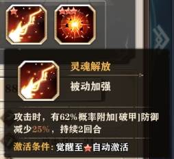 被动一星(灵魂解放):攻击时,有62%概率附加破甲,同时防御减少25%,持续2回合,该被动就是魅娅的核心被动,减防御以及破甲属性,能让己方阵容的伙伴轻松打出高额的伤害,同时使无法被控制的限时挑战boss变得更加容易攻击。