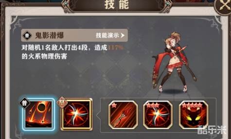 莲月的普攻技能【鬼影潜爆】是个多段单体技能,给随机1名敌人打出4段,共能造成117%的火系物理伤害。