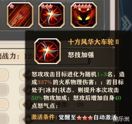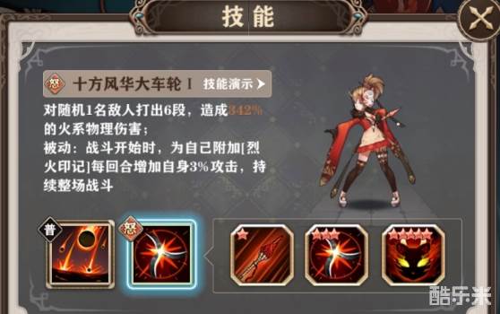 技能攻击【十方风华大车轮I】也是一个多段的单体伤害技能,能给随机的1名敌人共造成342%的火系物理伤害。