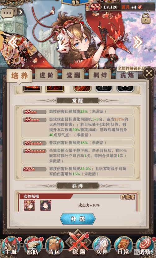 总体来说莲月莲月在觉醒到SS三星时就已经是个小boss级别的输出伤害,配合上怒攻后还可以回复怒气,能快速在下一轮中再次打出怒攻,且对于【冰封】的敌方还有个额外的伤害加成,所以阵容搭配上可以尽量选择能打出【冰封】效果的伙伴。