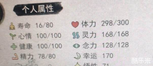 1、鬼谷八荒游戏中玩家们自己的人物总共拥有九条个人属性,分别是寿命、心情、健康、精力、体力、灵力、念力、幸运以及悟性。