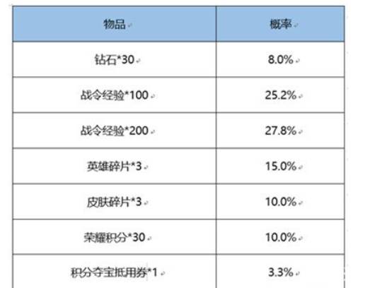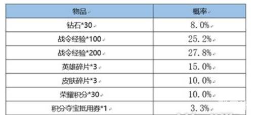 打开可随机获得以下奖励之一:芈月-幻夜卜梦、积分夺宝抵用券*1、英雄碎片*3、皮肤碎片*3、荣耀积分*30、100/200战令经验、钻石*30。