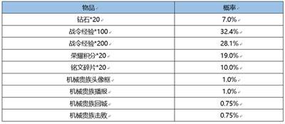打开可随机获得以下奖励之一:机械贵族头像框、机械贵族播报、机械贵族回城、机械贵族击败、荣耀积分*20、100/200战令经验、钻石*20、铭文碎片*20。