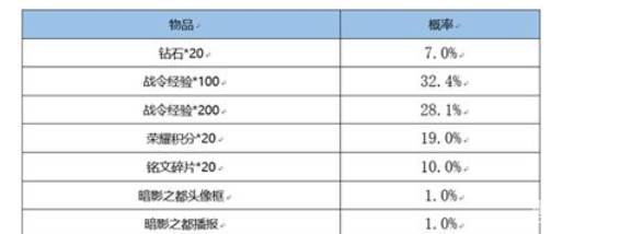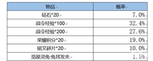 打开可随机获得以下奖励之一:心灵冲击·发型、心灵冲击·服饰、心灵冲击·武器、荣耀积分*20、100/200战令经验、钻石*20、铭文碎片*20。