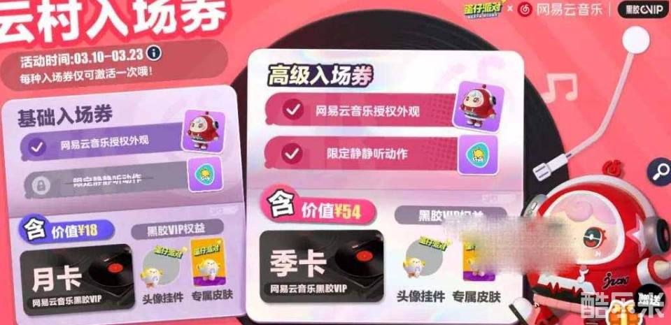 1、在3月10日至3月23日期间,蛋仔派对网易云音乐联动将正式上线,玩家可以通过活动页面购买云村入场券并解锁对应的礼包;