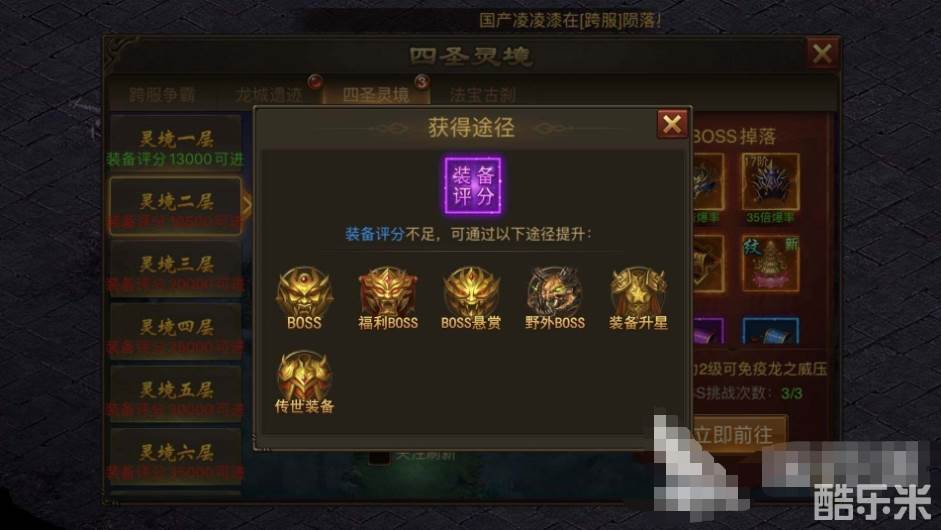 圣灵副本的要求:这个副本出现在开服一周后,出现两个服务器可以共同的活动中,需要玩家的装备评分达到1万3千分才能进入最简单的圣灵副本,因此普通玩家如果不是没日没夜的刷装备一般都达不到这个评分。但是小编的套路非常多,直线不行咱们可以曲线进入。(圣灵副本可以刷法宝,非常珍贵)