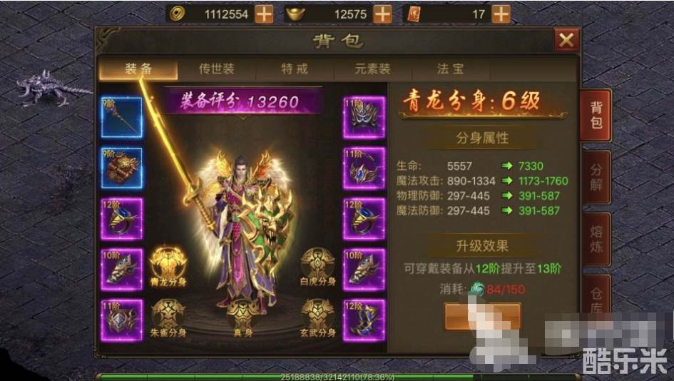 2.更换更好的装备:除了咱们的真身之外,还有四圣兽的分身可以携带装备,把青龙、白虎、朱雀、玄武都提升到13阶,携带的装备一定可以让装备达到1万3以上的评分。(每天去商城够买20个青龙魂,好事多磨)