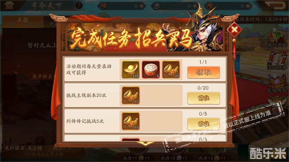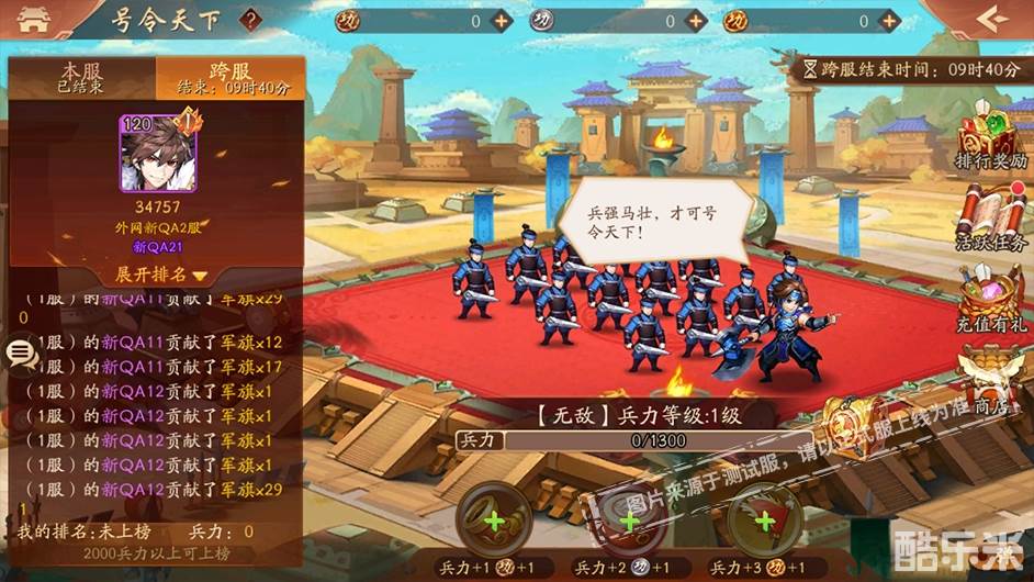 活动期间,通过充值、活跃、登录获得的军旗、军鼓、军号可招兵买马获得大量兵力,再根据兵力进行排名。排名分为本服排名以及跨服排名。
