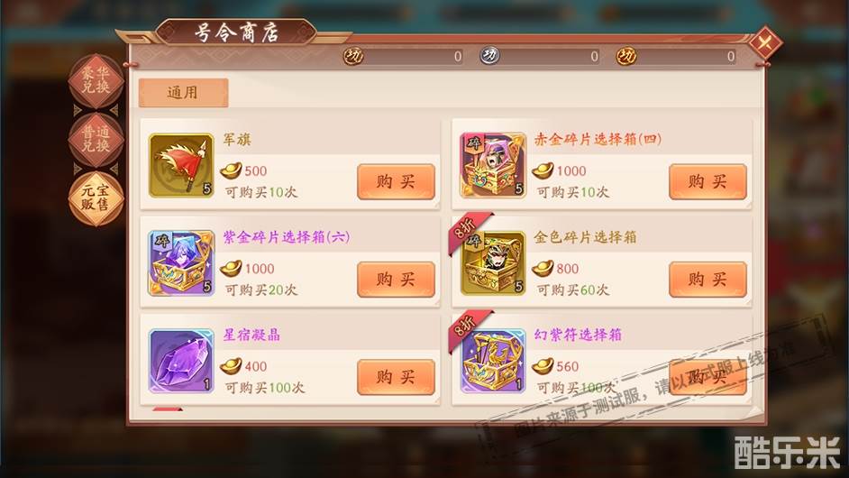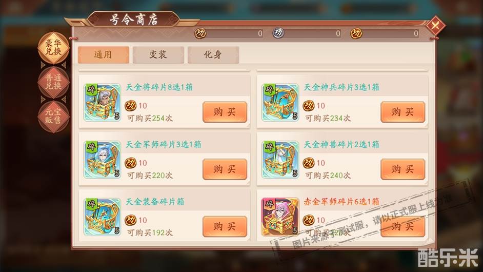 在通用商店中,可兑换天金将碎片8选1箱、天金神兵碎片3选1箱、天金军师碎片3选1箱、天金神兽碎片2选1箱、天金装备碎片箱、赤金将碎片20选1箱、赤金战法碎片6选1箱、赤金神兵碎片6选1箱、赤金神兽碎片6选1箱、赤金军师碎片6选1箱、赤金装备碎片箱、赤金兵符碎片10选1箱、紫金碎片选择箱(六)、天幻羽毛碎片、赤炼羽毛碎片、幻冥羽毛碎片、苍穹幻赤石、星宿凝晶等珍稀奖励;