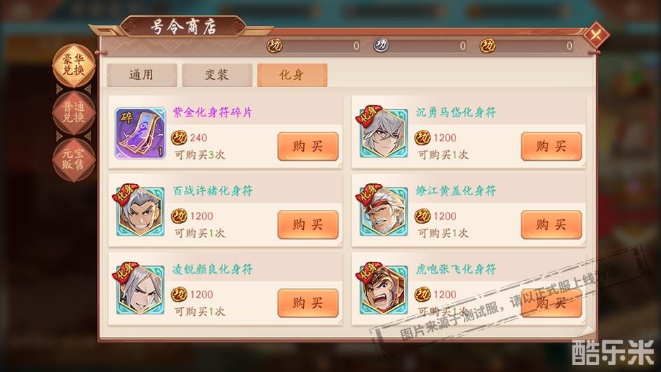 在化身商店中,还可兑换紫金化身符碎片、一至二代天金将化身符、赤金化身符,一定不要错过。