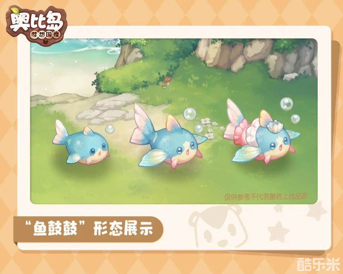 深受海神喜爱的「鱼鼓鼓」身体Q弹软萌,性格忠心真挚,当你不开心的时候,它会默默陪伴在你身边,为你分担烦恼~最高形态时,「鱼鼓鼓」会戴上它的专属贝壳王冠,十分华丽!它还有一个特别的能力,可以让它在海洋之外的地方生活哦,让我们欢迎「鱼鼓鼓」来到奥比岛!