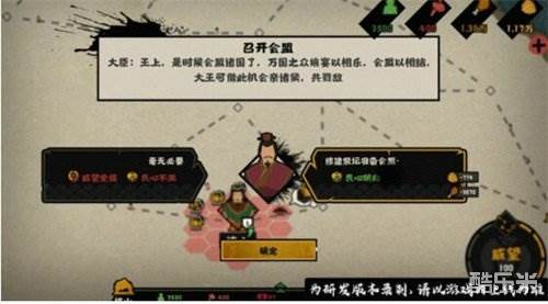 也就是说玩家们的“威望需要达到100点”,这时候会触发会盟随机事件,王上可通过消耗物资召开会盟。