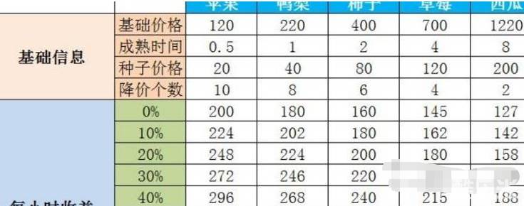 2、攻略二:选择种哪种水果也是非常有技巧的,每种水果的小时收益是不一样的,如下面表格所示。每小时收益从高到低粉笔是:苹果、鸭梨、柿子、草莓、西瓜。优先选择每小时收益高的,睡觉的时候则直接选西瓜。