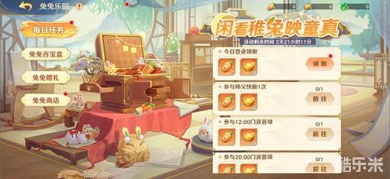 在女神节到来之际,玉兔公主悉心经营的兔兔乐园正式开门营业啦!在乐园中,各位守护使通过完成每日任务就能获得海量元宝,而使用收集来的兔兔萝卜刀去开启兔兔百宝盒,就能获得包含红将碎片在内的各种奖励!