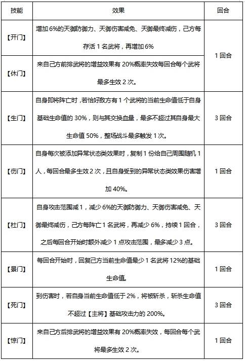 八门金锁阵的连锁反应为:每回合开始友军全体【开门】,敌方后排【休门】;友军平均生命值低于60%时,最低生命值友军触发【生门】;每回合开始敌军所有异常状态效果超过5个的单位施加【伤门】;敌军前排生命值80%时施加【杜门】;主将受到主动出手伤害,所在列施加【景门】;敌方武将死亡,为百分比生命值最低一名敌军施加【死门】;我方武将任意出手,为敌军前排施加【惊门】。