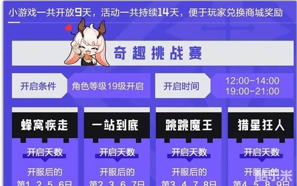 奇趣挑战赛一共开放9天,每天12:00-14:00;19:00-21:00都可登录参与小游戏挑战
