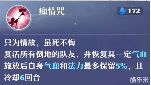 1、痴情咒:复活所有倒地队友,并恢复其气血。
