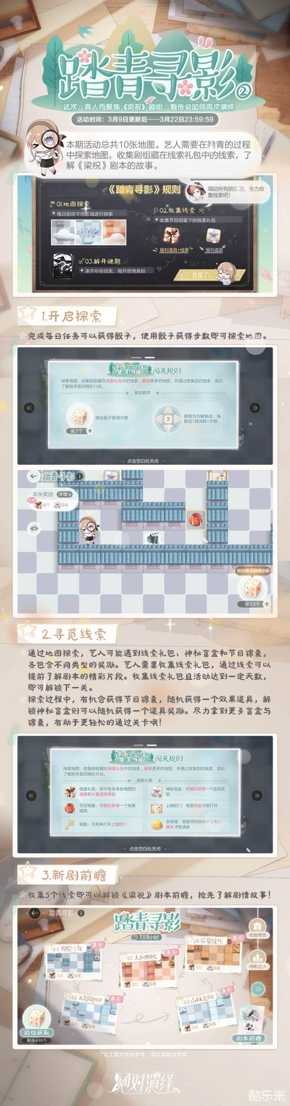 《踏青寻影》依托《梁祝》电影主线剧情设置关卡内容。玩家艺人需要在踏青过程中探索地图,途中可能遇到线索礼包、神秘盲盒和节目锦囊,各包含不同类型的奖励。玩家艺人完成每日任务可以获得骰子,使用骰子获得步数即可探索地图,收集线索礼包且活动达到一定天数,即可解锁下一关。最终,收集5个线索即可以解锁《梁祝》剧本前瞻,抢先了解剧情故事!