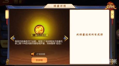 玉·磐石之固锦囊是所有武将都适用的锦囊,它可以在首次行动前附加自身生命上限100%的间接伤害吸收护盾,大大增加了武将在战斗中的续航抗伤能力,心仪的主公可千万不要错过了。