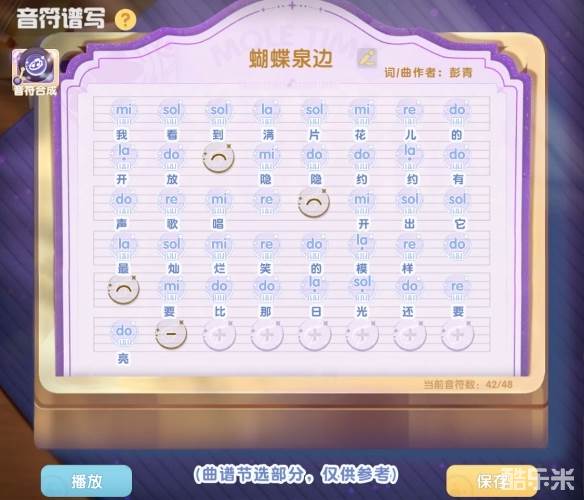 回到音符谱写界面,选择音符纸(完成和月月的对话就可以获得音符纸哦),点击“+”号位置填入音符,组成相应旋律,创作过程中可以播放试听,也可以暂时保存。