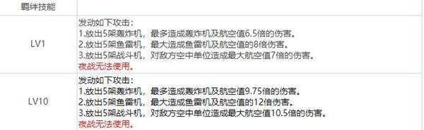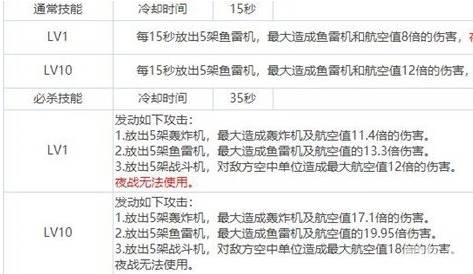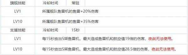 每15秒放出5架鱼雷机,最大造成鱼雷机和航空值19倍的伤害,夜战无法使用。