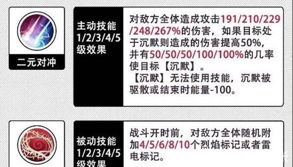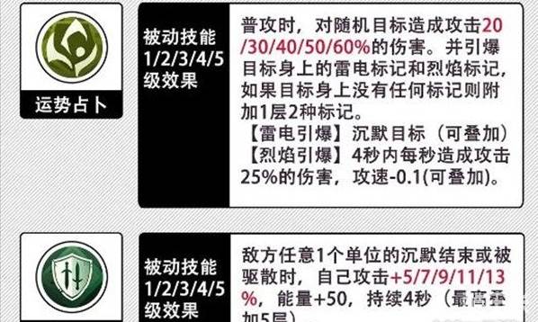 敌方任意1个单位的沉默结束或被驱散时,自己攻击+5/7/9/11/13%,能量+50,持续4秒(最高叠加5层)。