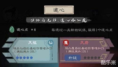 1、道心系统——以仙魔两个方向提升角色能力,属性同样适用于全角色~解锁条件:通关【十万荒漠·九重境】。