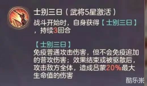 略有小成:[士别三日]无法被驱散,持续时间内受到来自敌方武将的所有伤害降低30%(从15%提升到30%);[士别三日]下遭受普攻时,100%概率(90%提高到100%)对攻击方施加[迟缓],会使目标普攻时额外消耗300点怒气。