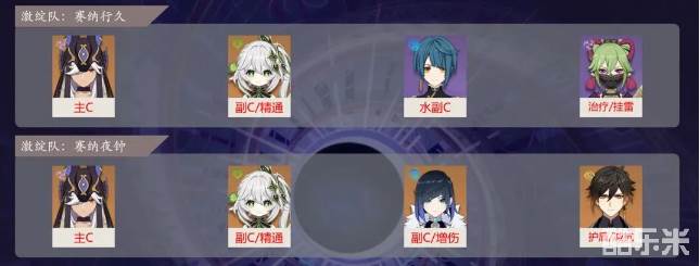 赛纳夜钟:主C赛诺 + 副C/精通提纳里 + 副C/增伤夜兰 + 护盾/减抗钟离