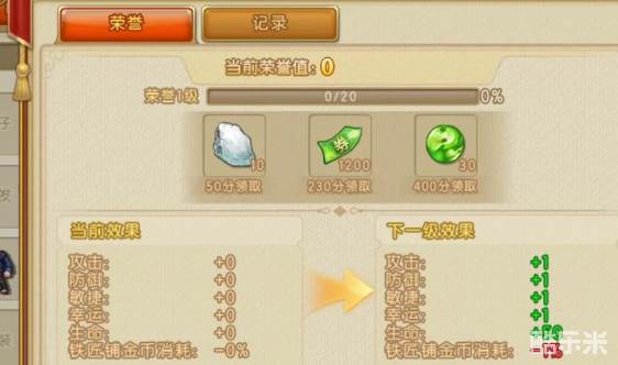 荣誉等级提升后可以获得道具奖励和属性提升,例如当达到荣誉一级时,将会奖励强化石、绑定点卷和首饰经验珠等,用于消费和强化相关装备。提升的属性包括攻击,防御,敏捷,幸运,生命值以及铁匠铺金币消耗。上面几种属性都是和战斗能力相关,在铁匠铺中无论强化装备、转化装备都需要消耗金币。荣誉等级越高则消耗金币的数量也就越少,累计起来也是很可观的。