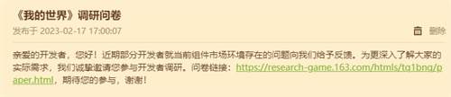 就我了解到的情况来看,近年国内付费组件市场其实隐隐有一种“硬卷”的趋势,不少开发者刻意售卖“低价”组件,通过恶意竞争扰乱付费组件市场,但玩法质量却没有跟上,不少开发者对此也诸多怨言,也让玩家体验遭受冲击。在资源中心功能全面优化升级之前,网易曾对开发者就市场现存环境问题进行过调研: