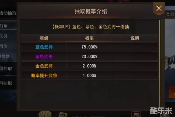 游戏的抽卡概率为2%,50%的歪率没有大小保底这一说法,而因为游戏要抽相同武将,导致游戏的抽卡体验也好不了多少,但因为目前武将少,运气好的话也能抽齐武将,但说实话看见这建模真的有能让人抽的欲望吗?