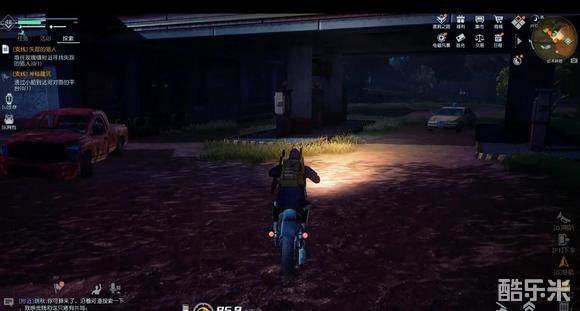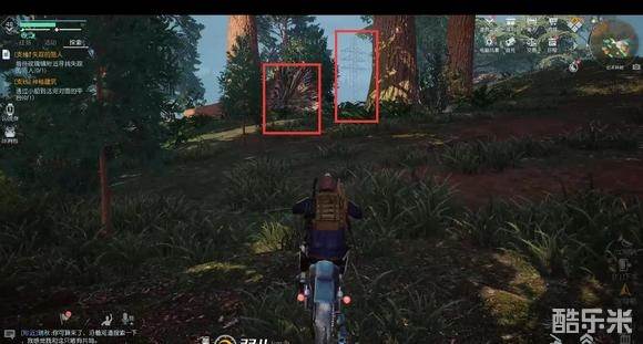 拿到之后,我们打开地图,可以看到,传送点依旧是在一条土路的旁边,我们沿土路向地图的右侧行进,在过程当中会穿过一个,木制的门楼,这时我们放慢速度,将视角向右看,当可以看到远处电线杆的时候,调转车头向电线杆方向行驶,可以看到,这里有一个横在地上的木头,在树根的旁边有一个小倒霉蛋,在他的身上,我们可以获得一个藏宝图。
