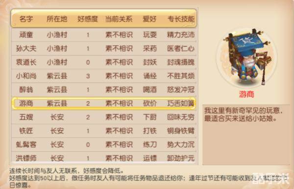 三界友人系统,游戏过程中跟NPC互动(做任务、交物品等)会提升NPC对玩家的好感度,获得相应技艺技能的经验;当好感度达到一定程度后,做任务需要交物品时,三界友人有可能将任务物品退还给玩家;逢年过节时,玩家还可能收到三界友人赠送的珍惜物品。