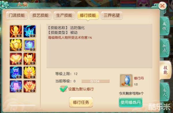 30级后可以领取修行任务获得修行经验或使用修行丹进行技能升级,修行丹可通过部分玩法获取或直接在商城购买