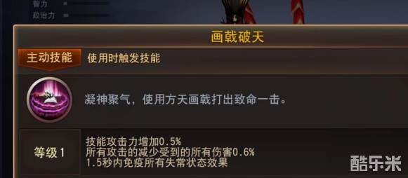 武神咆哮可以将周围敌人拽到自己身旁,并且造成物理伤害,这一步是为了将周围零散怪物全部聚集到一起,方便使用接下来的画戟破天打出致命一击。不仅攻击力高,而且在使用之后的1.5秒内还能使自身免疫所有异常状态,即使面对比较复杂boss也能轻松击破,不会受到各种失常状态影响是最大优势。替战效果也同样非常炫酷,从赤兔马上跃下对范围内敌人造成伤害和眩晕,所以完全可以将这一效果利用起来,先让其他武将登场,清理小怪攻击boss时再换上吕布。