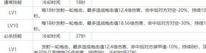 每18秒发射一轮炮击,最多造成炮击值18.56倍伤害,命中后对方对空-30%,持续10秒。