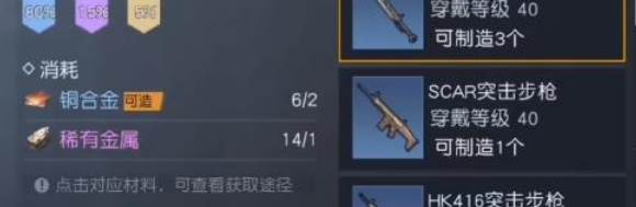 点击它之后便会出现对应所需要用到的材料是什么,如果各位缺少里面的一种材料的话,就可以点击它,然后会出现它的详情介绍,其中就会有这个东西的获取途径,而其中有些材料也是能够在武器制作台还有市场中获取到的。