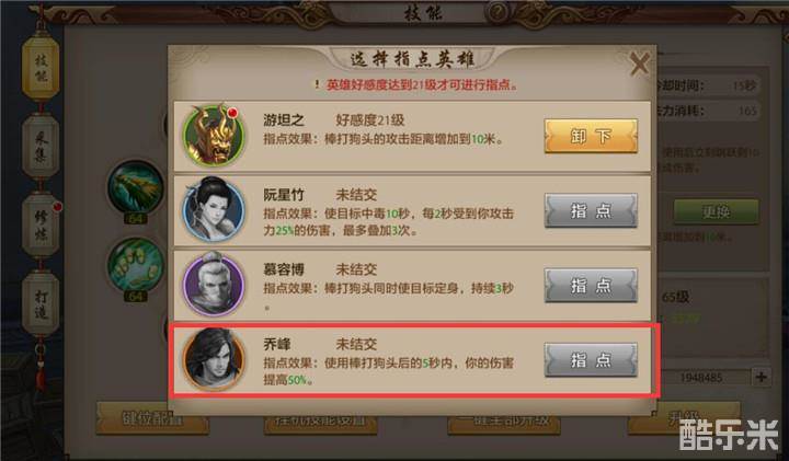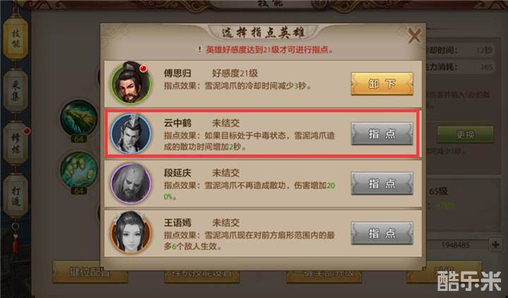 丐帮职业野外对战峨眉职业,首先技能方面需要选择英雄指点效果。亢龙有悔技能选择苏星河指点,青龙出水选择阿朱指点,时乘六龙技能选择鸠摩智指点,横扫乾坤技能选择叶二娘指点,雪泥鸿爪选择云中鹤指点,千里横行选择南海鳄神指点,八步赶蝉技能选择玄慈指点,棒打狗头技能选择乔峰指点。