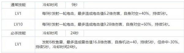 发射6枚鱼雷,最多造成雷击值16.8倍伤害,自身机动+40,持续5秒,但命中-30%,持续5秒,冷却时间24秒。