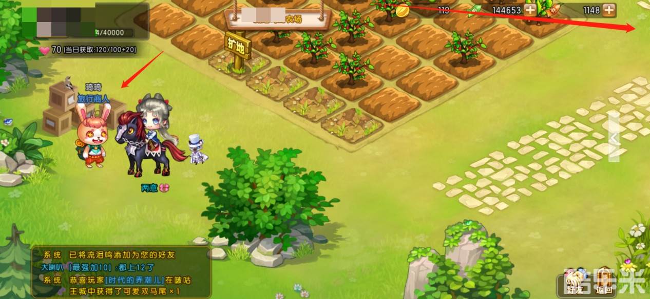 进入农场后,旅行商人会出现在两个固定位置的任意一个点,分别是红箭头指向的:农田左下方和农田右上方,千万不要看漏错过了哟。