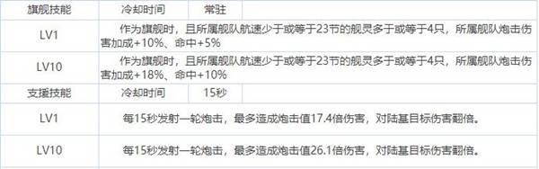 作为旗舰时,且所属舰队航速少于或等于23节的舰灵多于或等于4只,所属舰队炮击伤害加成+10%、命中+5%