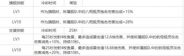 每25秒发射4枚鱼雷,最多造成雷击值12.6倍伤害,并使所属舰队中的航母舰灵攻击伤害减免+ 10%,持续10秒。