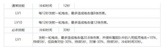 发射一轮炮击,最多造成炮击值31.2倍伤害,并使所属舰队中的八咫舰灵炮击+ 15%,持续5秒,但自身对空-20%,持续5秒、对潜-20%,持续5秒,冷却时间30秒。