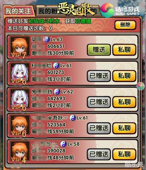 在《恶灵退散》中好友之间关注是单方面操作的,即关注好友无需向好友提交繁琐的申请。关注好友之后,每天会有一定向好友赠送“初级战斗药水”的机会,向好友赠送“初级战斗药水”可以得到用于学习人物技能的“功德值”。如果说,获得“功德值”是可以靠自己就完成的任务,那么如何获得更多好友赠送的“初级战斗药水”就需要靠自己在游戏中与好友的关系啦。