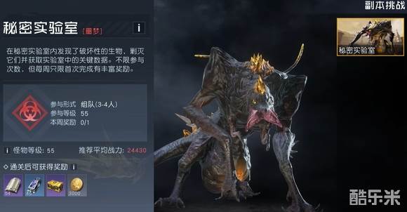 当等级提升到55级后,开放新的周本噩梦难度秘密实验室,推荐评分战力是2.44万,如果战力低于副本推荐战力,建议其中一个人带个奶枪,会好打非常多,只是打的慢而已。还有需要注意的是这个本你死了之后是不能复活的。