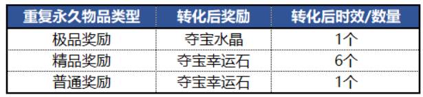 6、夺宝过程中,如果重复获得已拥有的永久奖励,那么重复获得的奖励内容将根据奖励级别自动转化为不同数量的夺宝水晶或夺宝幸运石,转化规则如下: